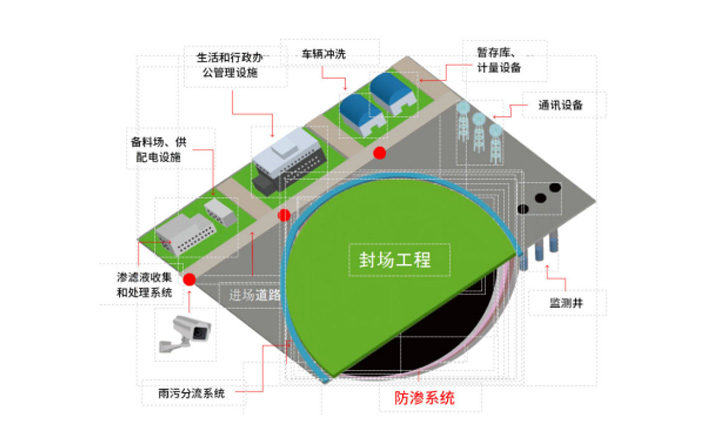 主体工程:计量设施,暂存库,地基处理与防渗系统,防洪、雨污分流及地下水导排系统,场区道路,垃圾坝,渗沥液收集和处理系统,填埋气体导排和处理(含可利用)系统,封场工程及监测井等。