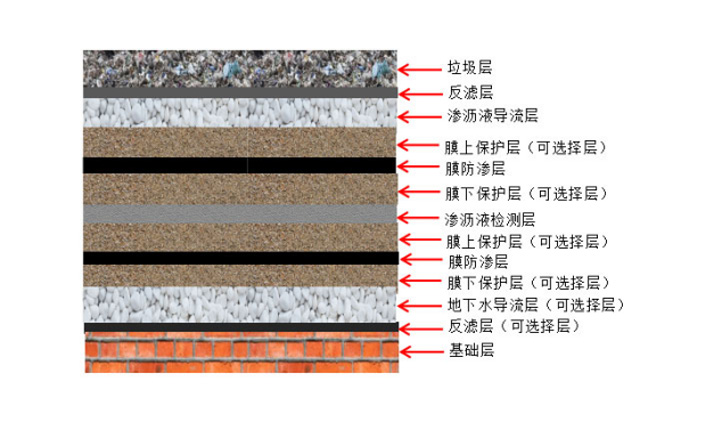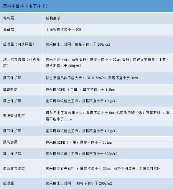3、人工合成衬里的防渗系统应采用复合衬里防渗结构,位于地下水贫乏地区的防渗系统也可采用单层衬里防渗结构 。在特殊地质及环境要求较高的地区,应采用双层衬里防渗结构 。