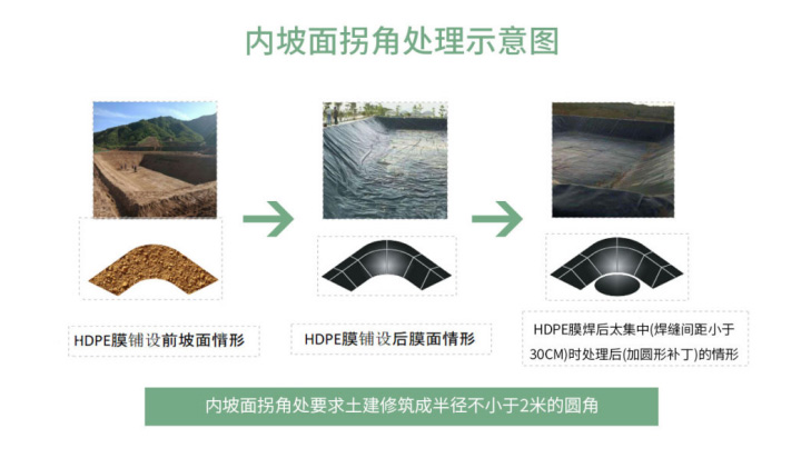 在渠道的边坡与场底衔接部位的坡脚处,同样需经特殊处理。这种情况下的施工要点为:把边坡上的HDPE膜顺着坡面铺设在距坡脚1.5m以外,再与场底的HDPE膜进行焊接处理。