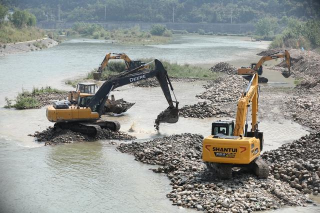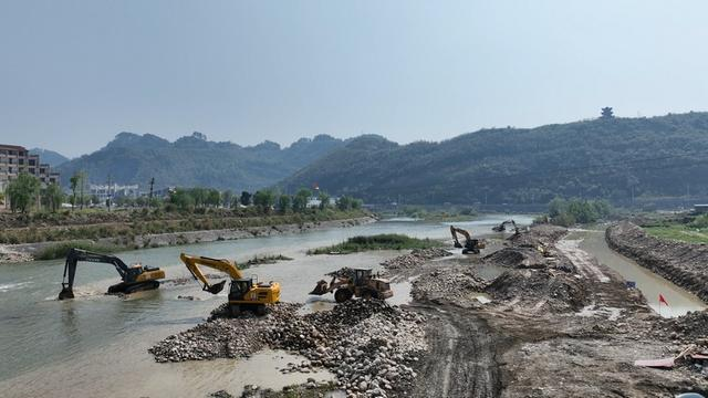 在贵州省柳江(独山县、三都县段)治理工程三都县新城社区柳江河段,工人们驾驶挖掘机、推土机等多台大型机械有序进行清障,开挖河堤基脚,平整河床,现场一派热火朝天的繁忙景象。